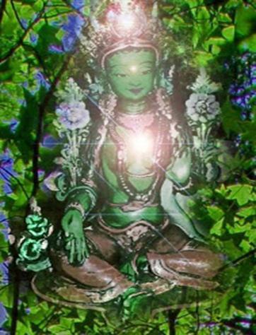 Agora todos os iluminados assumem a forma de Tara. Há no espaço acima e ao redor de nós milhões e bilhões de Taras Verdes de aparecimento primoroso que como chuva caem em nós e são absorvidas em nossos corpos
