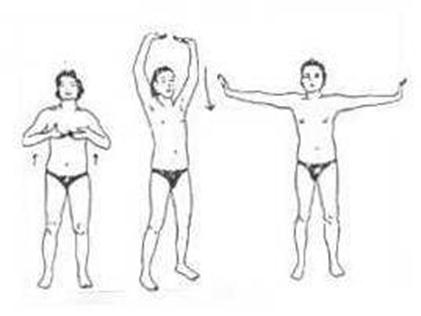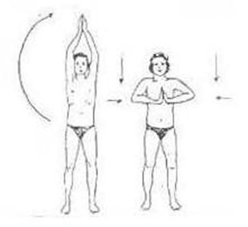 Inalar: erguer os braços lateralmente como traçando um círculo em torno da cabeça. Quando chegar ao topo, manter mãos unidas em oração acima da cabeça.