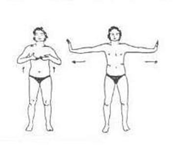 Exalar: separar alongando os braços. Baixar lateralmente com as palmas das mãos para baixo.