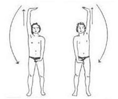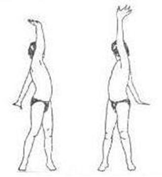 Exalar: braço esquerdo baixado, direito erguido. Palmas idem. Torcer o tronco até enxergar o calcanhar oposto. Repetir invertendo os braços e o sentido de rotação.
