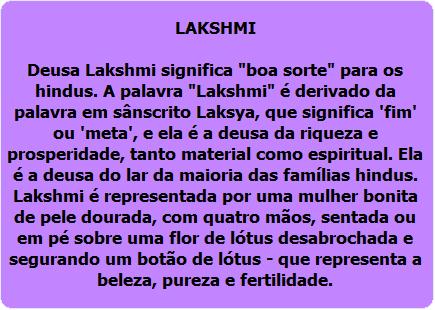 Neste artigo trago a oração da deusa Lakshmi, que significa "boa sorte" para os hindus. A palavra "Lakshmi" é derivada da palavra em sânscrito Laksya, que significa "fim" ou "meta", e ela é a deusa da riqueza e prosperidade, tanto material como espiritual. Ela é a deusa do lar da maioria das famílias hindus. Lakshmi é representada por uma mulher bonita de pele dourada, com quatro mãos, sentada ou em pé sobre uma flor de lótus desabrochada e segurando um botão de lótus - que representa a beleza, pureza e fertilidade. É também personificação da beleza, da fartura, da generosidade e principalmente da riqueza e da fortuna.
