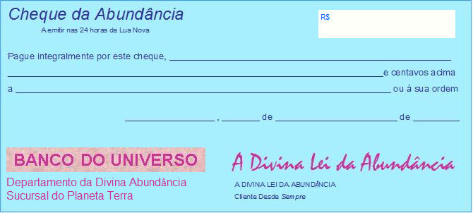 Emitindo este cheque você alinha a tua intenção com a do Universo para novas parcerias, para manifestação de seus dons e desenvolvimento de suas capacidades, para suprimento de necessidades materiais, para realização de seus sonhos, para alinhamento com a Alegria, Criatividade, Paz, Amigos, Harmonia, enfim... Você se conecta com a Energia da Abundância, se abrindo para que esta se manifeste em sua vida.
